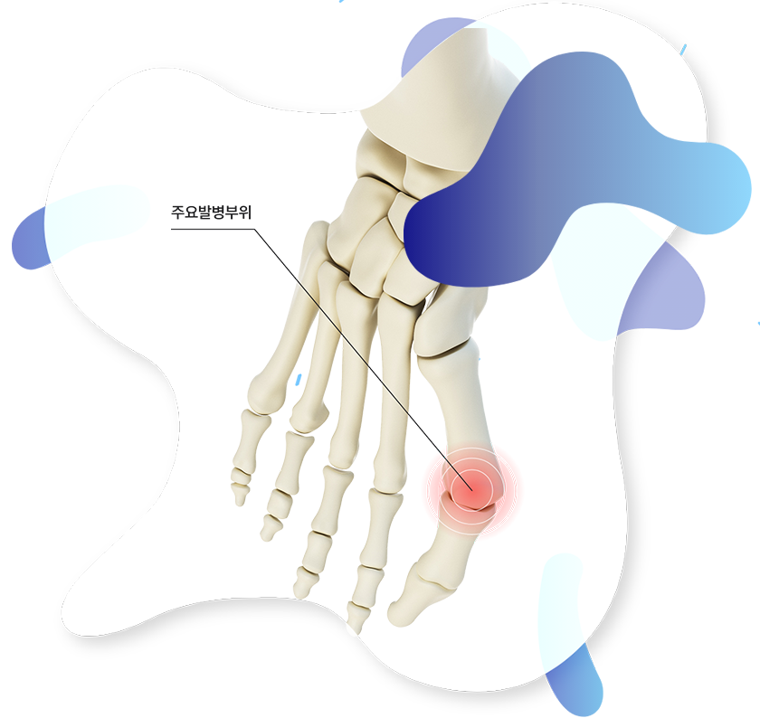 - 엄지발가락이 휘어지는 등 변형이 보이고 통증이 발생함.
